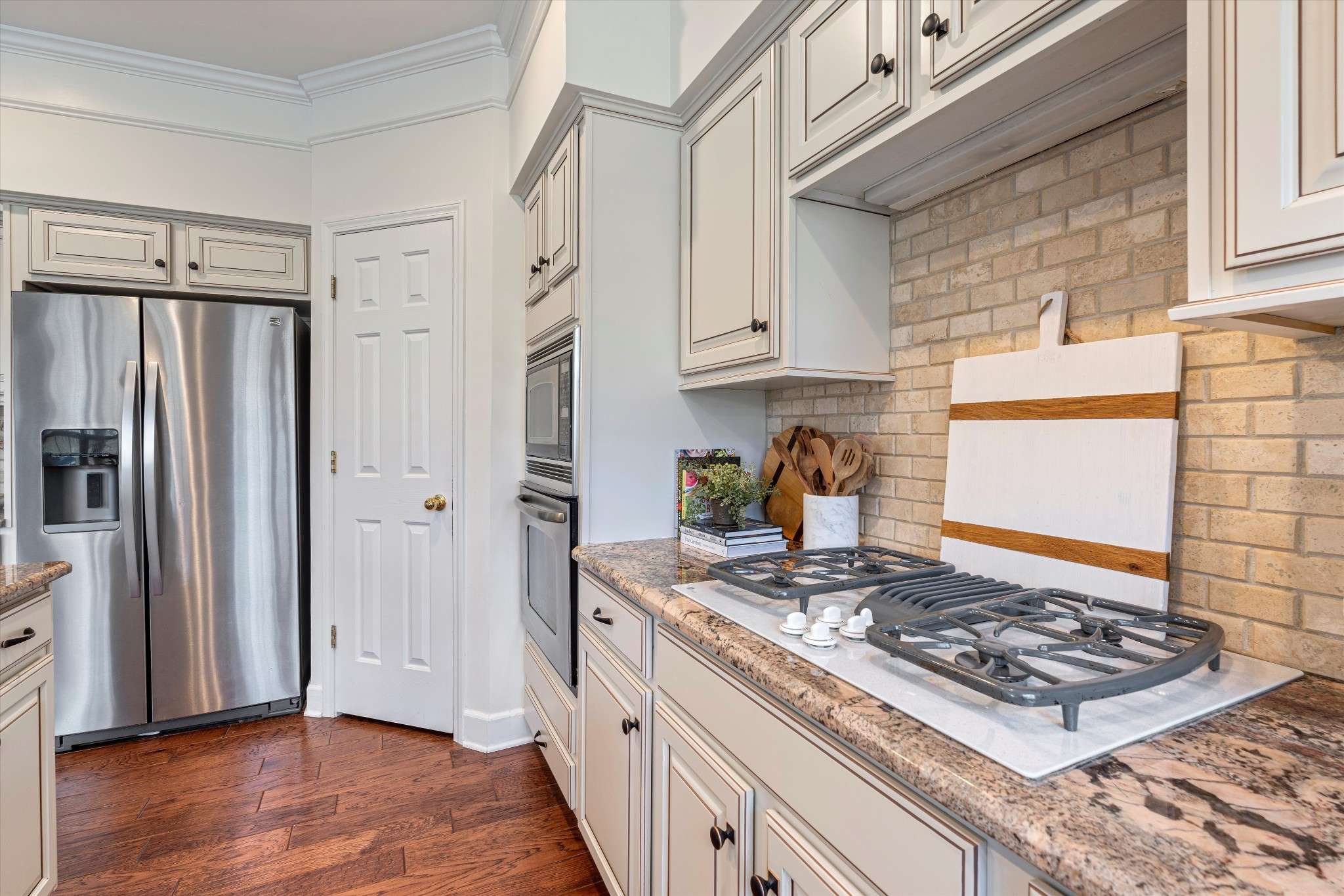 Step inside this stunning all-brick home, perfectly nestled in the desirable Williams Grove neighborhood. The inviting den features a wall of windows, flooding the space with natural light, and a cozy gas fireplace framed by shiplap, a custom wood mantle, coordinating shelves, and accent lighting. The two-sided fireplace seamlessly connects to the versatile flex room—ideal for play, a workout area, or additional living space. The open, eat-in kitchen is a chef's dream with ample cabinetry, pull-out shelves, and a distinctive copper sink. It overlooks the fully fenced backyard, complete with a charming pergola, perfect for outdoor entertaining. The main floor features beautiful wide-plank hickory floors throughout. Upstairs, the spacious primary suite offers a serene retreat with a tray ceiling and a luxurious en-suite bathroom. The oversized walk-in closet, large frameless shower, and separate soaking tub create a spa-like atmosphere. The home's charming nursery is a standout, with vertical shiplap walls painted in Farrow & Ball paint, along with custom shelving and cabinetry in the closet, adding a touch of elegance and function. The convenient laundry room includes built-in cabinets, a utility sink, and a washer/dryer with pedestal bases (the washer base is also a small, second washer). For your peace of mind, the side-entry two-car garage features new garage doors and a sturdy steel storm shelter, ensuring safety during inclement weather. This home is a must-see! Community Amenities include Clubhouse, Pool & Tennis.